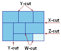 Introducing one more level of cuts produces "XYZW-cut" (Level 5). The example of this type of cuts is shown on the picture. XYZW-cuts are used if there are many different part sizes required and better material utilization is desirable.